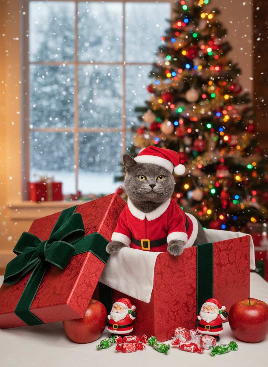 Click to Generate a Photo – Instantly Get a Stunning Artwork Similar in Style to "Cute Festive Pet Christmas Gift Box"