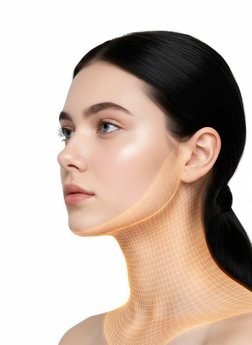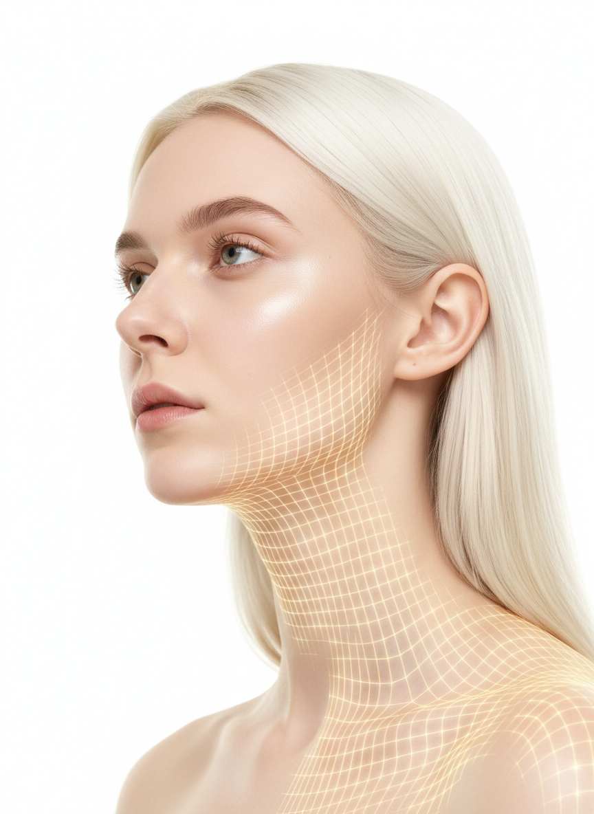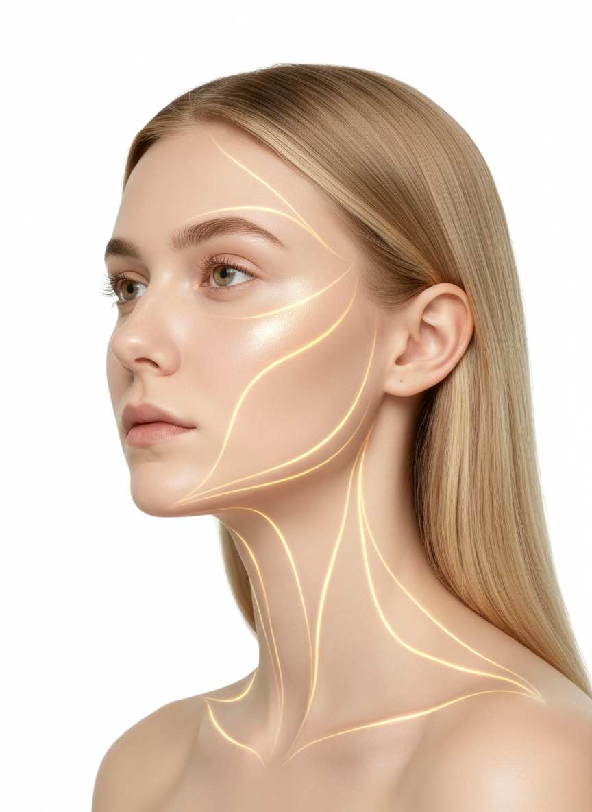 Core elements include sleek skincare product styling (minimalist, metallic, or translucent packaging), subtle tech integrations (glowing LED accents, holographic displays, digital interfaces), cinematic lighting (soft gradients, dramatic highlights, ambient glows), futuristic backdrops (clean tech labs, minimalist chambers, or abstract digital environments), and luxury texture contrasts (smooth glass, metallic finishes, and creamy product formulations). The overall vibe is opulent, forward-thinking, and visually dramatic—fit for blockbuster-level brand storytelling.