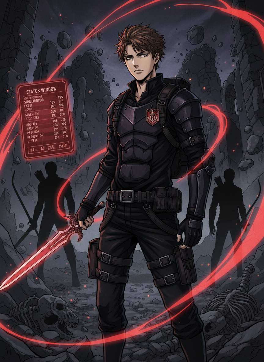 Core elements include gritty dark fantasy aesthetics (moody color palettes, worn armor with intricate engravings, shadowy accents), dynamic action poses (mid-combat stances, power-charging frames, or imposing victory poses), power-infused effects (glowing auras, particle bursts, or elemental energy tied to the character’s class), detailed gear (scaled armor, cursed weapons, or tech-fantasy hybrids), and sharp, expressive features (intense eyes, stoic expressions, or subtle battle-worn details). The overall vibe is intense, powerful, and visually striking—true to Solo Leveling’s high-stakes world.