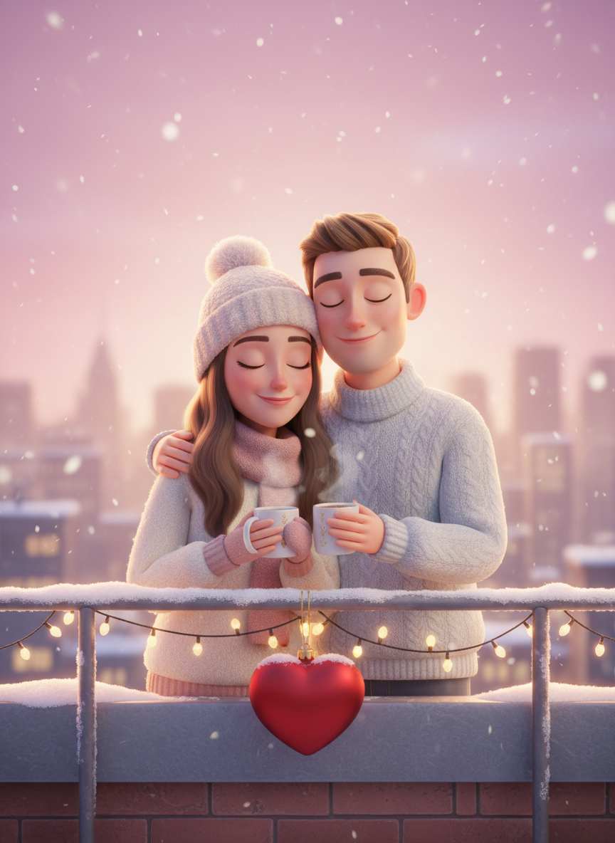 Core elements include 3D cartoon character charm (soft, rounded 3D features, expressive faces, cute proportions, and smooth textures), romantic Valentine’s details (hearts, roses, love letters, balloons, or heart-shaped accents), sweet couple dynamics (gentle embraces, holding hands, forehead touches, or playful smiles that convey love), Valentine’s color palettes (pastel pinks, soft reds, creamy whites, and gentle purples), and 3D depth (natural shadowing, dimensional character rendering, and layered elements for a tactile feel). The overall vibe is warm, romantic, and delightfully cute—perfect for capturing the essence of Valentine’s Day.