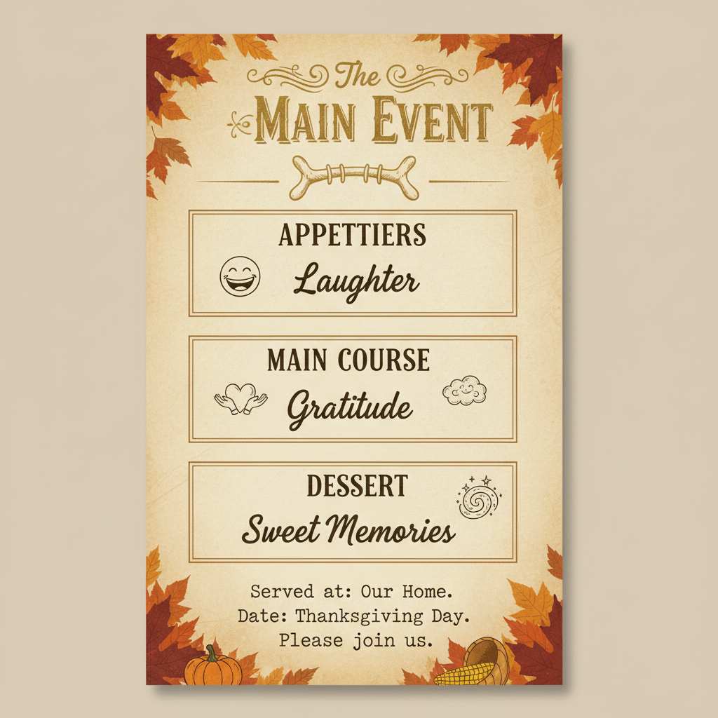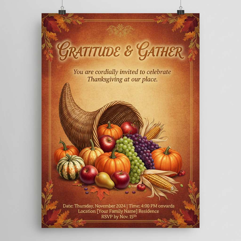 Yes. The generator adapts to various gatherings, including intimate family dinners, casual friend potlucks, formal community banquets, or kid-friendly Thanksgiving parties. Simply specify your event type in the prompt—for example, “kid-friendly Thanksgiving invitation with cartoon turkeys and pumpkin pie illustrations” or “formal Thanksgiving banquet invite with gold foil accents.”