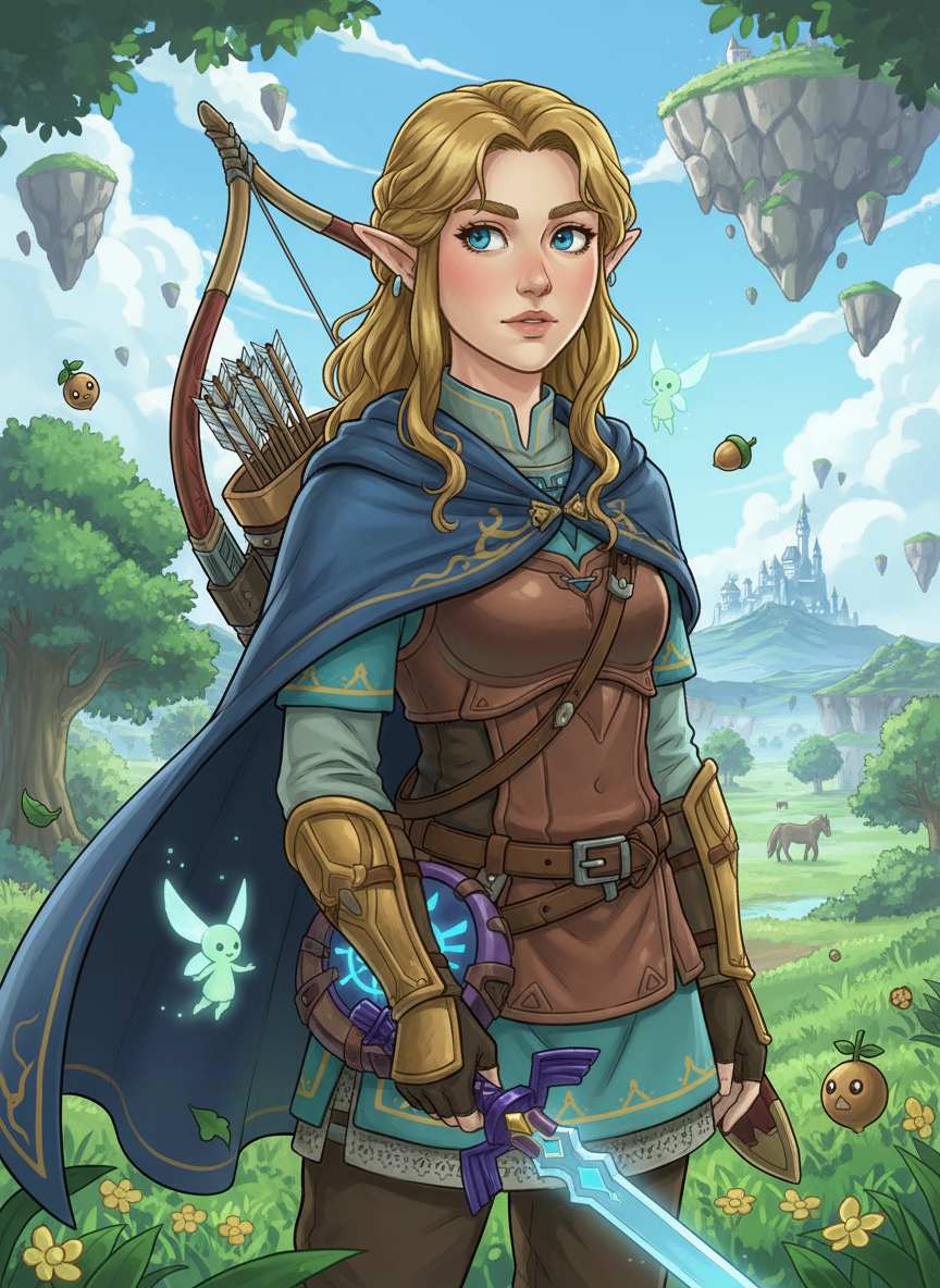 Core elements include whimsical fantasy landscapes (lush forests, floating islands, crystal-clear lakes, or ancient ruins), medieval-fantasy architecture (stone towers, wooden cottages, and temple structures with LoZ’s signature curved roofs), mythical creatures (fairies, koroks, dragons, or horses), magical flair (glowing runes, enchanted weapons, or ethereal light), and nostalgic color grading (vibrant greens, warm golds, and soft blues that mirror the series’ visual identity). The overall vibe is adventurous, charming, and deeply rooted in LoZ’s fantasy world.
