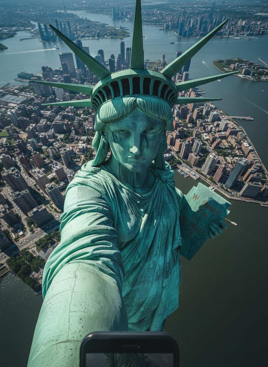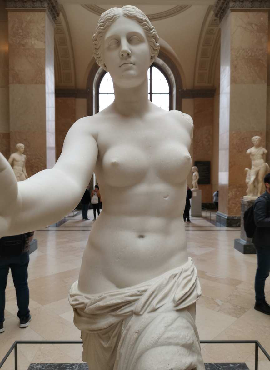 Core elements include faithful sculpture details (accurate facial features, pose, material texture—marble, bronze, stone—and proportion of iconic famous sculptures), whimsical selfie mechanics (a natural, believable holding pose for a phone/selfie stick that fits the sculpture’s anatomy, subtle device details that don’t overpower the art), playful tone (soft expressions, relaxed posing, or a hint of personality that balances classic art gravitas with modern fun), artistic cohesion (device/selfie elements blended seamlessly with the sculpture’s style and material), and subtle modern accents (minimal phone screen glow, a simple selfie stick, or soft shadowing for the device). The overall vibe is creative, lighthearted, and respectful of the original sculpture—never overly silly or disrespectful.