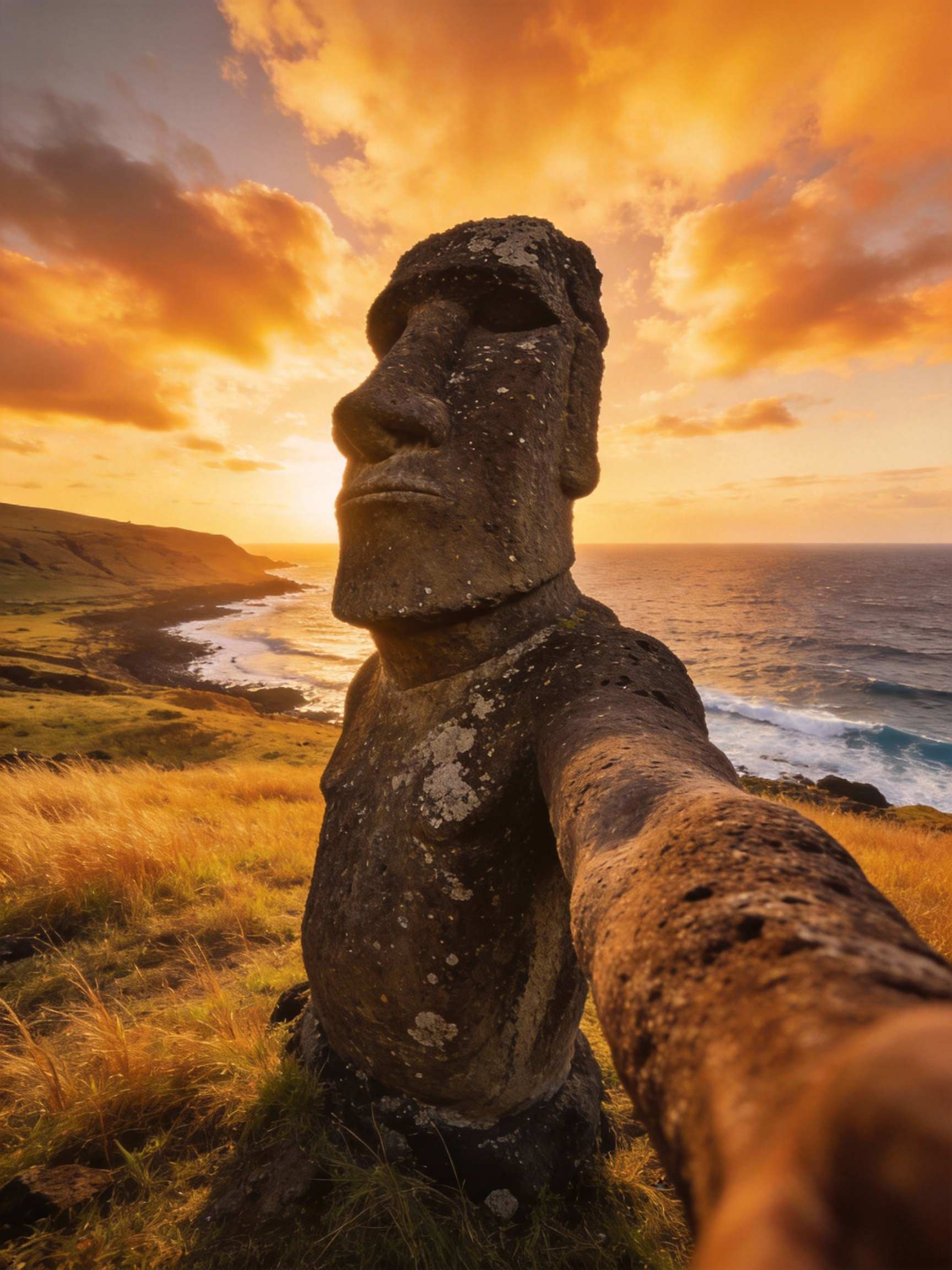 a minimal phone with soft posing, quirky/funny. a bright selfie stick with a playful expression, cute/lighthearted. a small vintage camera with a relaxed stance) and device prominence (minimalist. a tiny phone with no screen glow, moderate. a standard phone with soft glow, bold. a sleek selfie stick with a faint screen reflection). The AI retains the sculpture’s core identity regardless—higher whimsy never makes the design disrespectful, and bolder device elements still blend seamlessly with the sculpture’s material and posing.