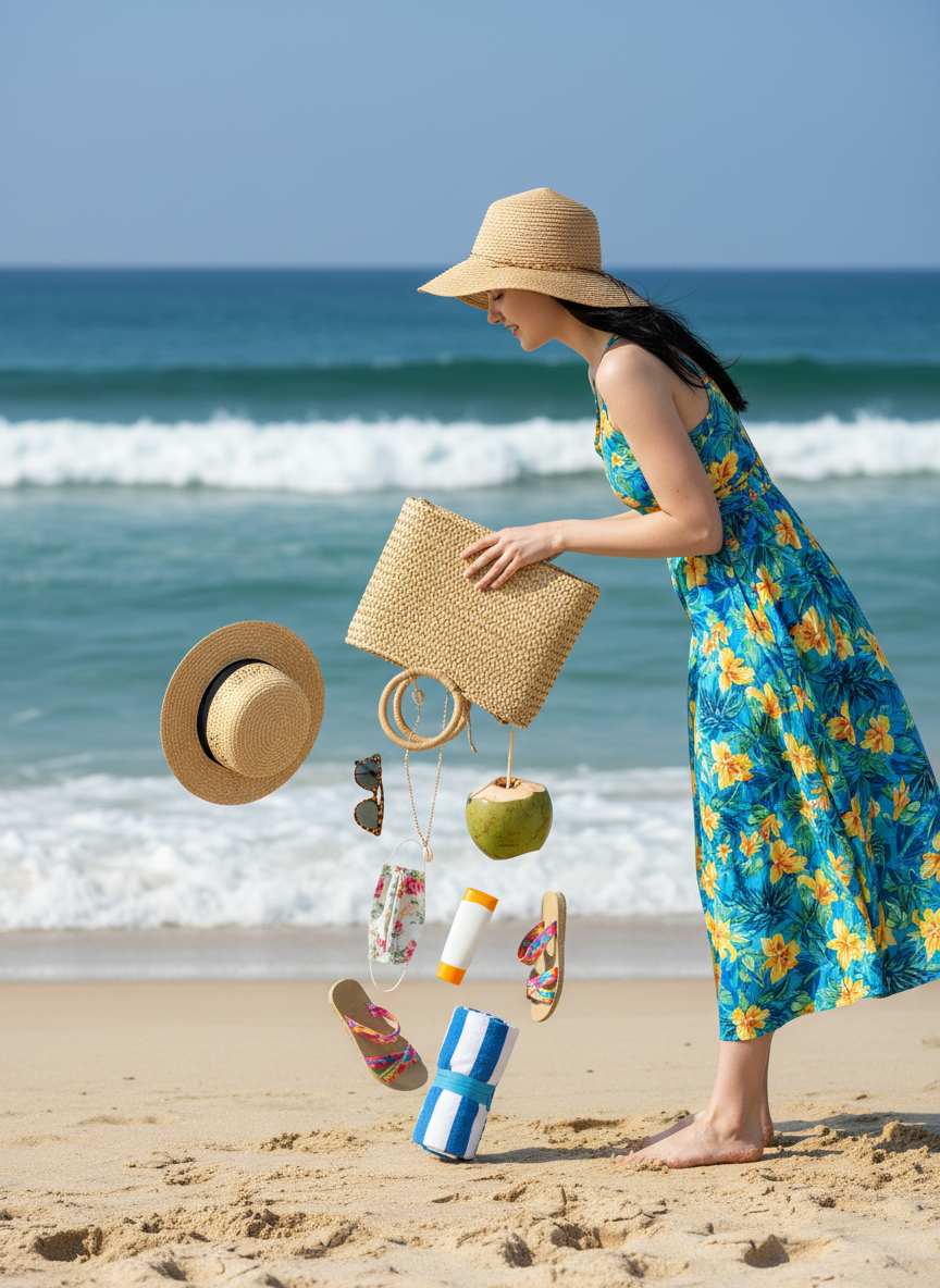 Core elements include natural dynamic motion (items falling with realistic trajectory, floating with gentle drift), whimsical aesthetic cues (soft pastels, sparkles, or glowing accents), curated item variety (cohesive themes—e.g., books, toys, or magical objects—with distinct shapes/sizes), bag design cohesion (style matching the items, e.g., a vintage satchel for books, a sparkly pouch for magical trinkets), and balanced composition (items arranged to guide the eye without clutter). The overall vibe is joyful, magical, and visually engaging.