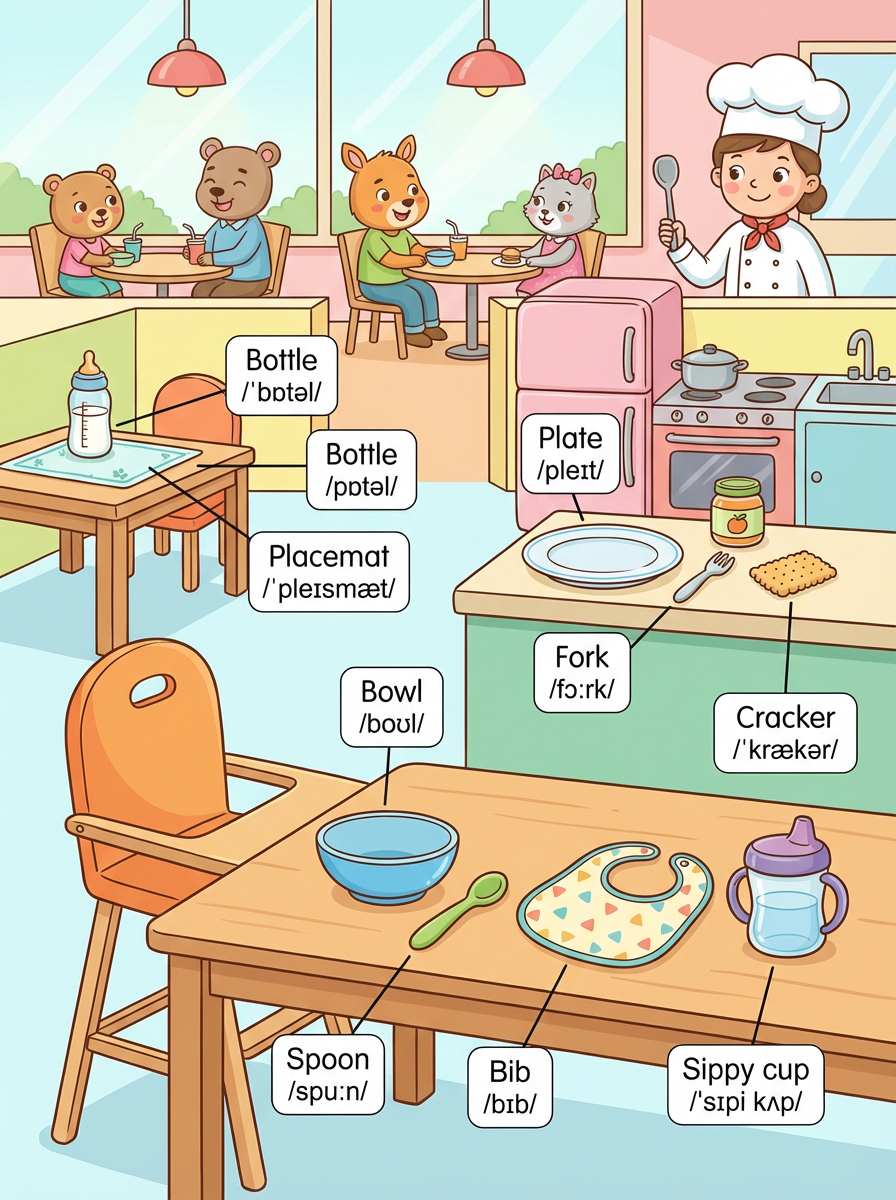 Core elements include age-appropriate vocabulary (simple words for toddlers, themed terms for older kids), clear word-image pairing (illustrations that directly reflect word meaning for easy association), playful visuals (cute characters, colorful scenes, and kid-friendly textures), readable typography (bold, simple fonts with proper spacing), and organized layout (grouped words by theme—e.g., animals, food—to aid retention). The overall vibe is cheerful, encouraging, and optimized for early learning.
